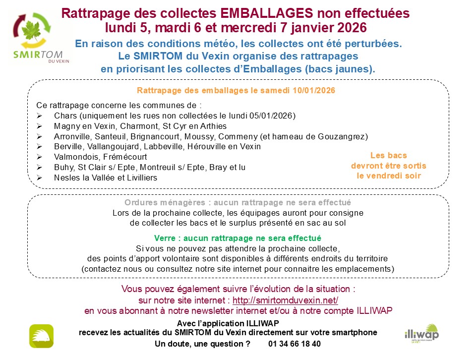 Pour connaître les jours de passage du camion dans votre commune, téléchargez votre calendrier sur notre site (en sélectionnant votre commune dans le bloc « Votre commune »), renseignez-vous dans votre mairie ou auprès du SMIRTOM du Vexin au 01 34 66 18 40.